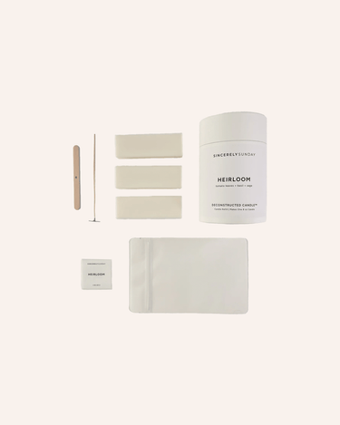 Sincerely Sunday Heirloom candle refill kit contents laid out: wax, wick, clip, pouch, label, and sustainable packaging. Sincerely Sunday Heirloom candle refill kit contents laid out: wax, wick, clip, pouch, label, and sustainable packaging.